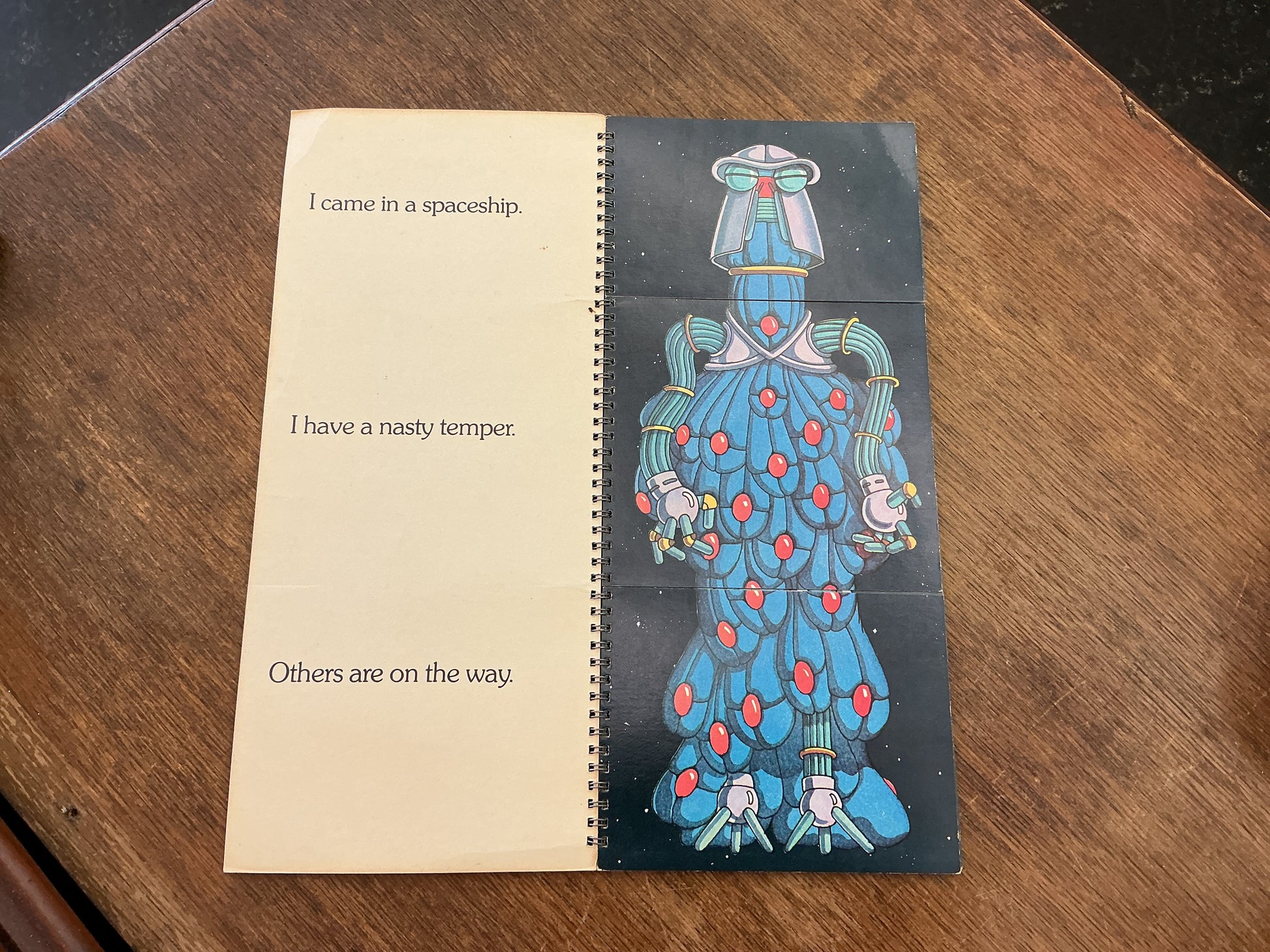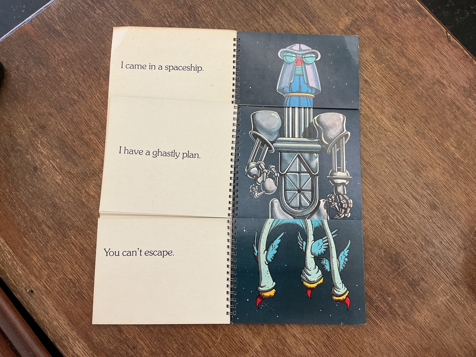 Ten fanciful drawings of space monsters divide into three captioned segments which can be flipped into 1000 combinations.