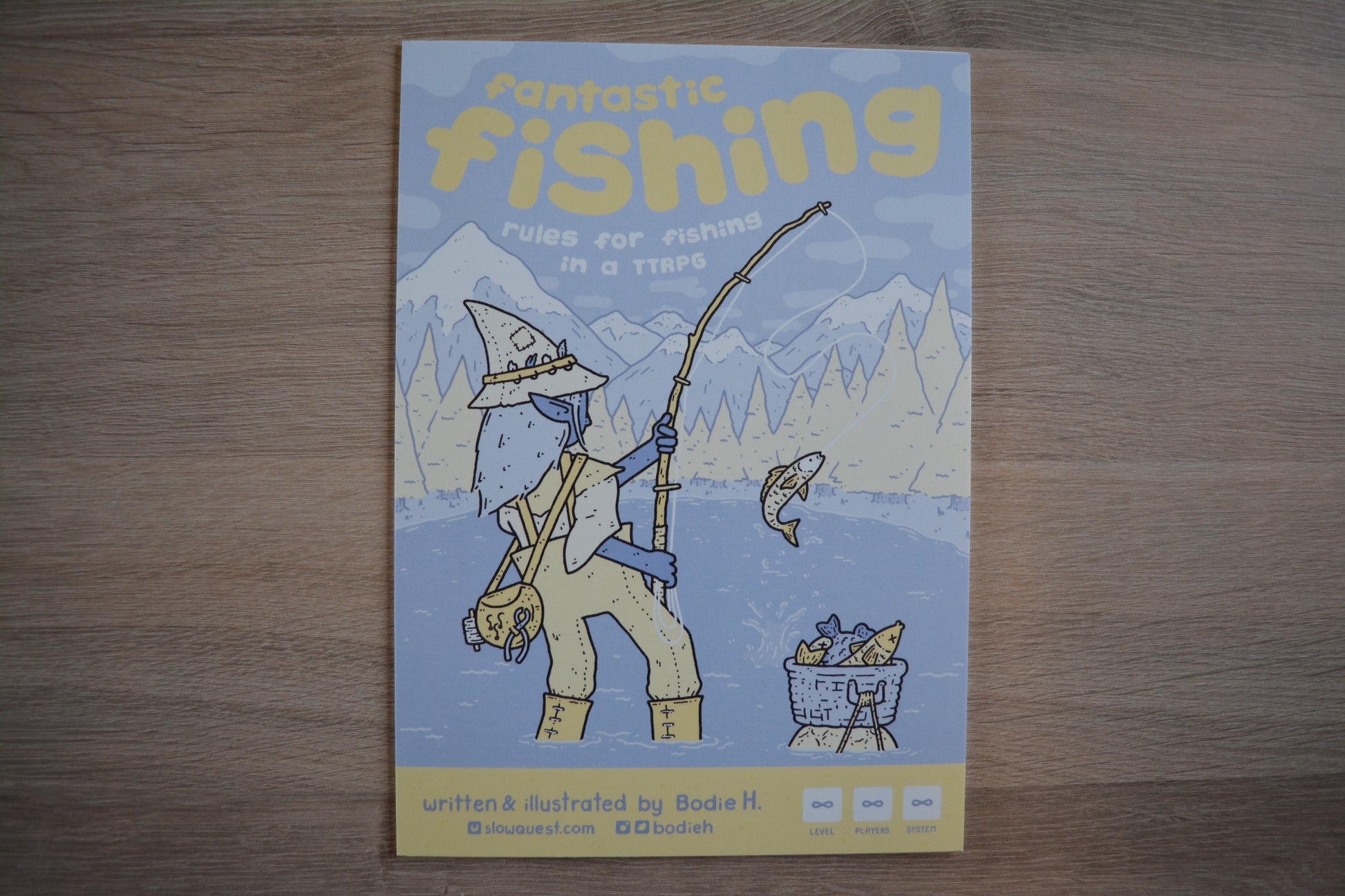 A fun, light-hearted module that brings fishing into your fantasy TTRPGs! Fishing plays like it's own fun mini-game, with a variety of bait to be used, and two illustrated tables of fantastical fish to catch.